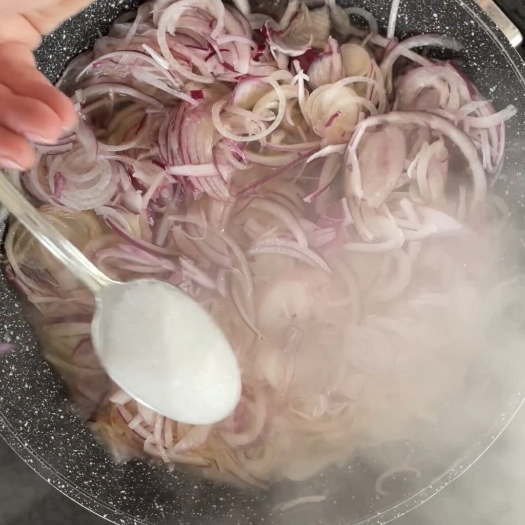 Quando estiver ficando macia, adicione outra colher de açúcar e, se necessário para amolecer e cozinhar ainda mais a cebola, adicione algumas colheres de água. Continue cozinhando até que a cebola esteja bem macia e sem líquido na frigideira. O tempo de cozimento é indicativo, pois varia muito conforme o tipo de cebola.