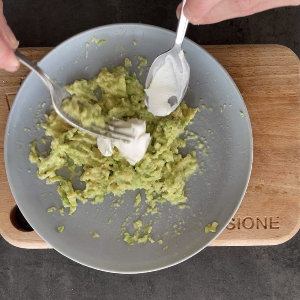 Quando os cestinhos de piadina estiverem frios, ficarão sólidos e crocantes, coloque-os no prato de servir e preencha-os com o creme de abacate.