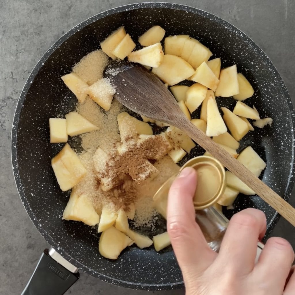 Coloque as maçãs em uma panelinha, adicione 2 colheres de sopa de açúcar, canela em pó e algumas colheres de sopa de água.