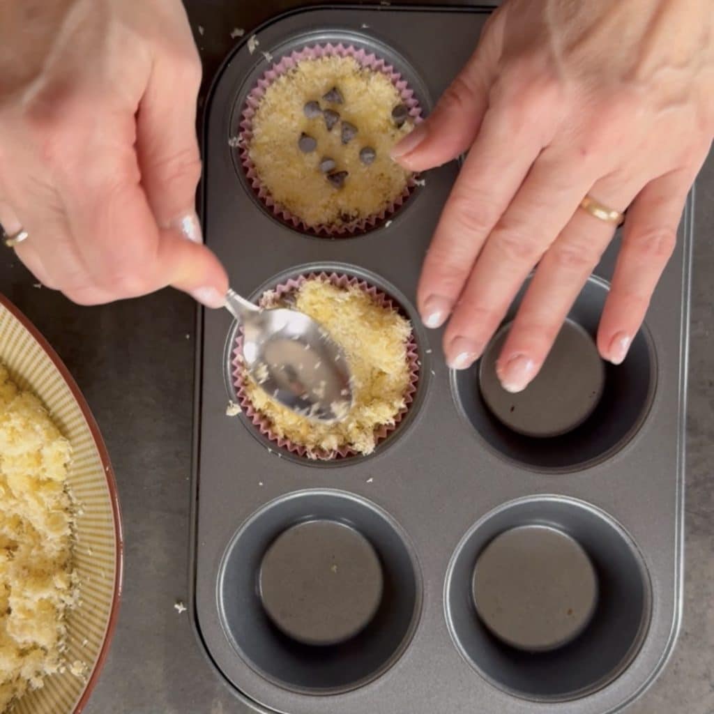 Coloque as forminhas de papel na forma de muffin e despeje a mistura, ficará bem esfarelada,