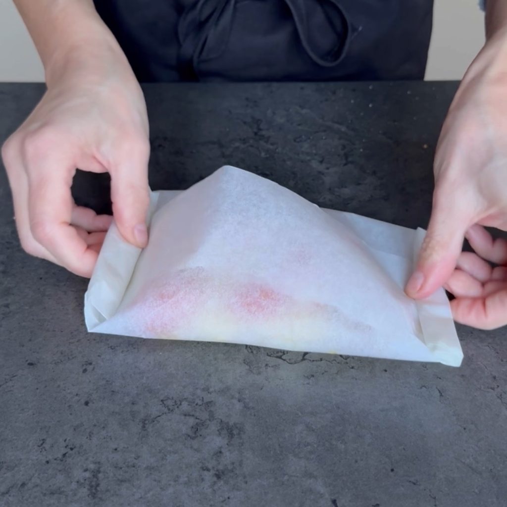 • Feche o papel manteiga formando o papillote e dobre bem as extremidades para que o papillote fique bem fechado durante o cozimento. Cozinhe em forno estático pré-aquecido a 180°C por 30 minutos.