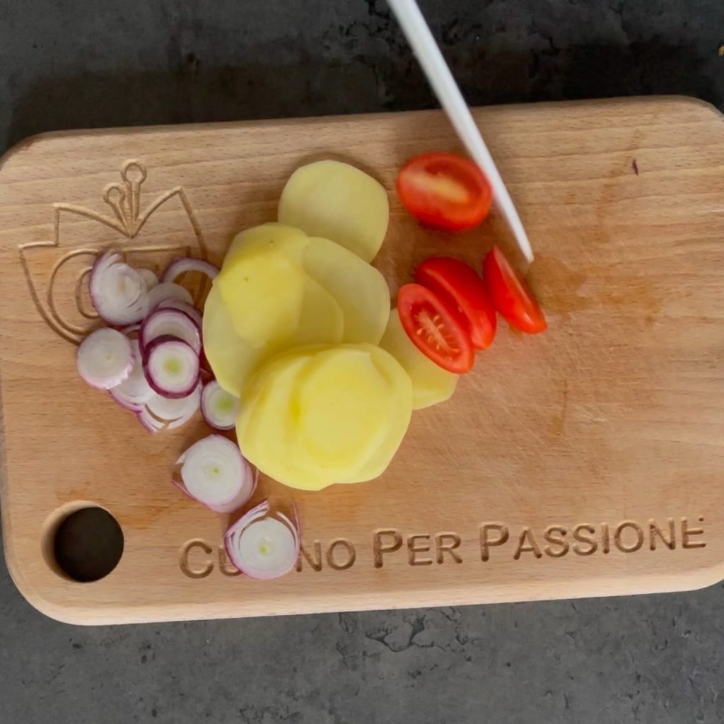 • Comece a preparar a dourada em papillote com batatas e tomatinhos, descasque a batata