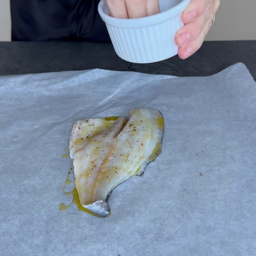 • Coloque o filé de dourada em uma folha de papel manteiga, adicione azeite extravirgem