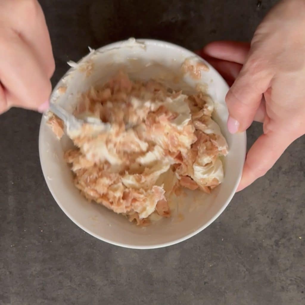 Começamos a preparar os enroladinhos de massa folhada com atum e philadelphia, coloque o philadelphia em uma tigela e trabalhe com um garfo,