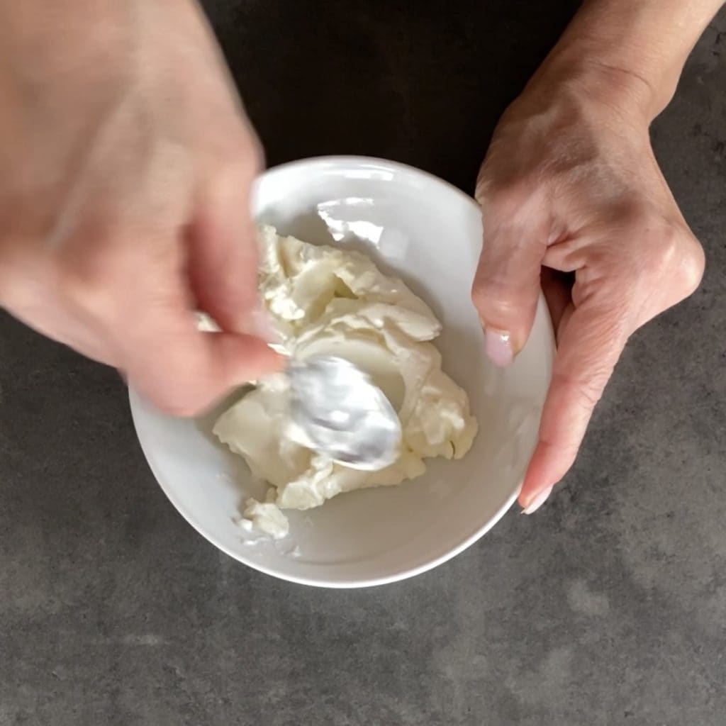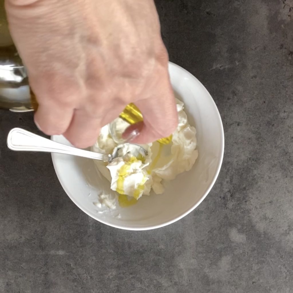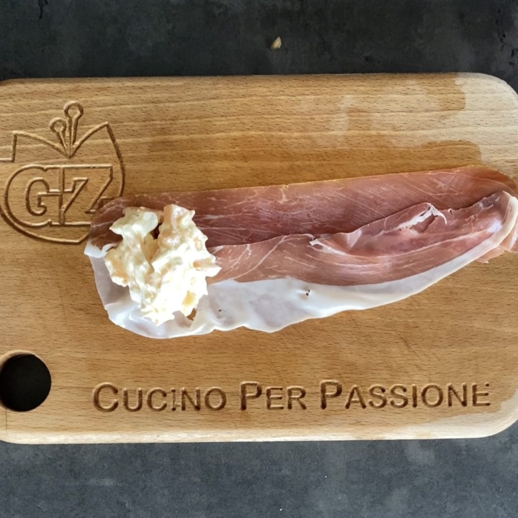 • Pegue uma fatia de presunto cru, adicione o creme de queijo e melão