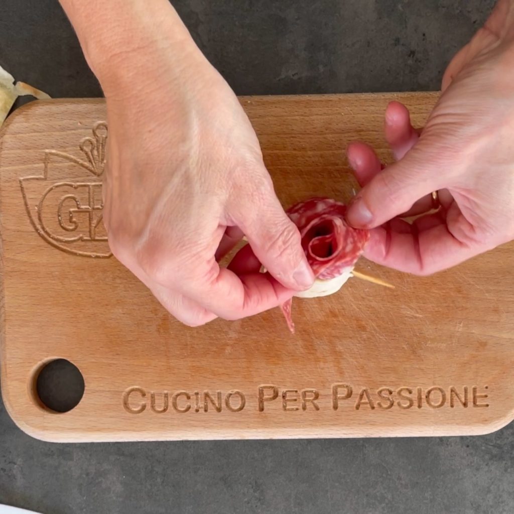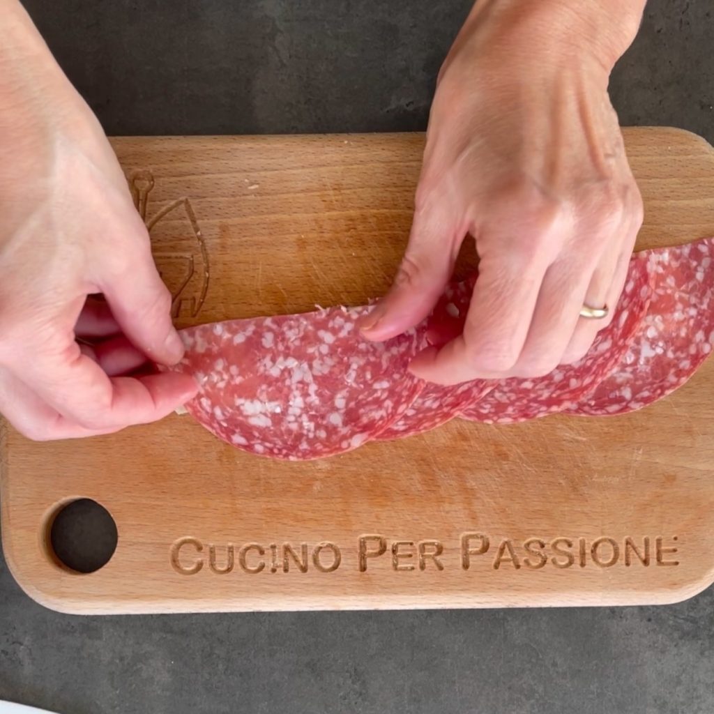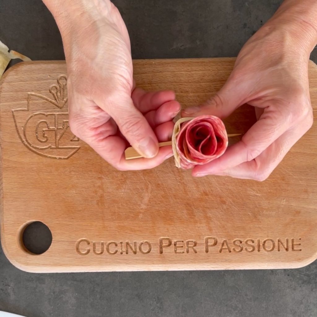afaste as fatias de salame para fora de forma a dar movimento à rosa de salame e fazê-la parecer mais bonita e natural.