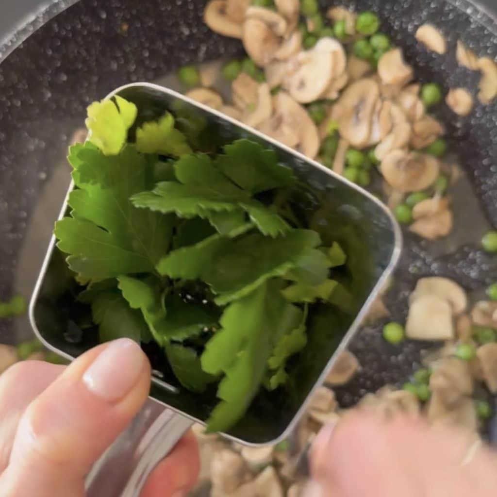 • Quando os cogumelos estiverem cozidos, remova o alho, ajuste o sal e adicione salsa picada,