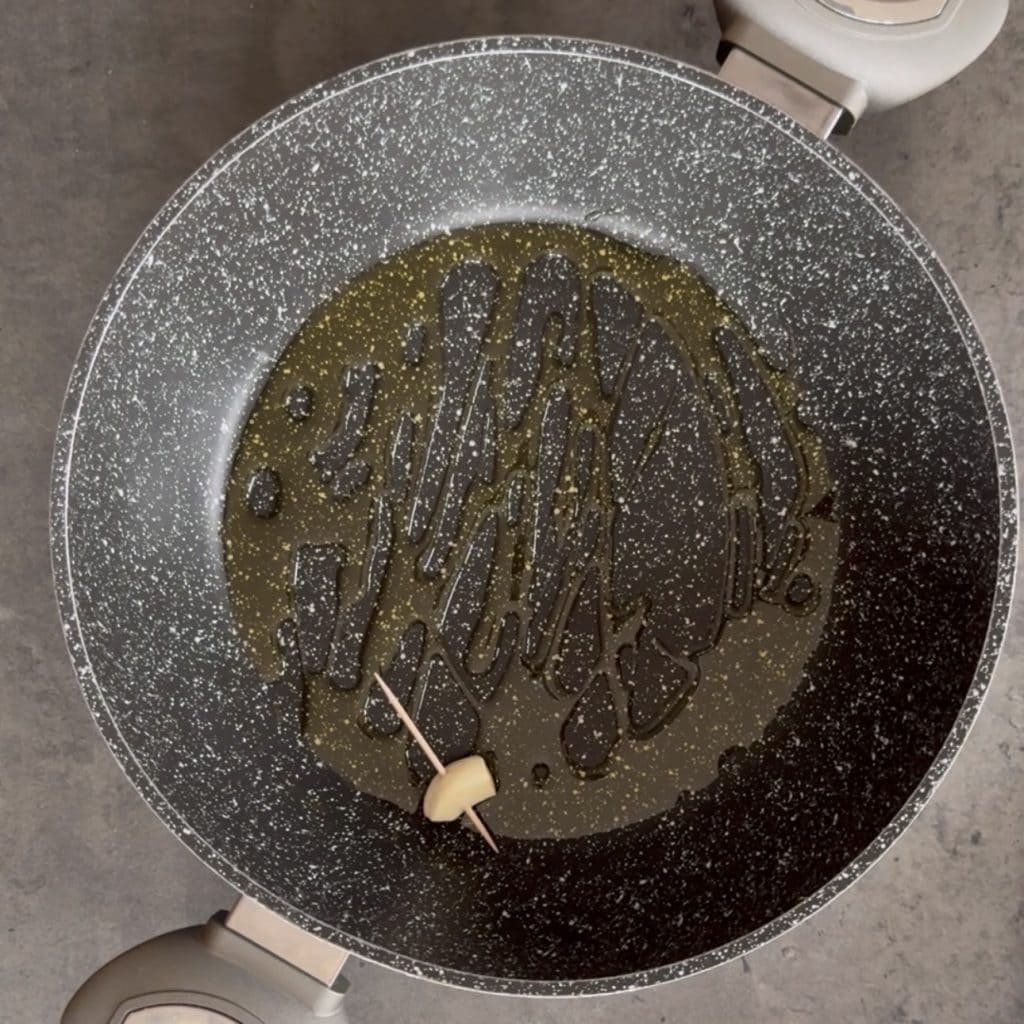 Coloque em uma panela o azeite de oliva e o dente de alho,