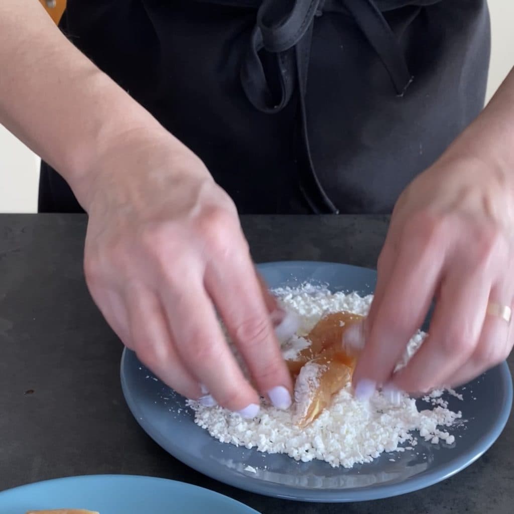 Coloque em um prato o‘amido de milho ou farinha de arroz e passe os pedaços de frango.