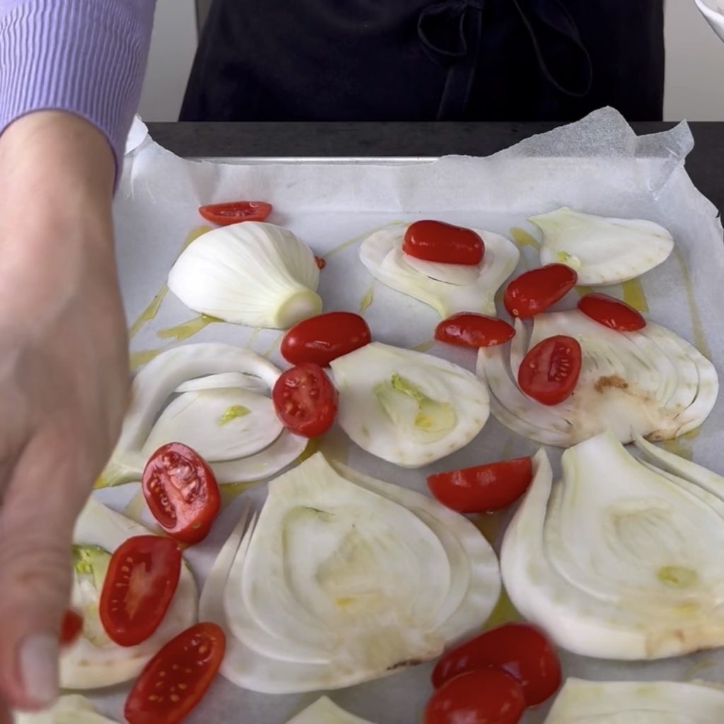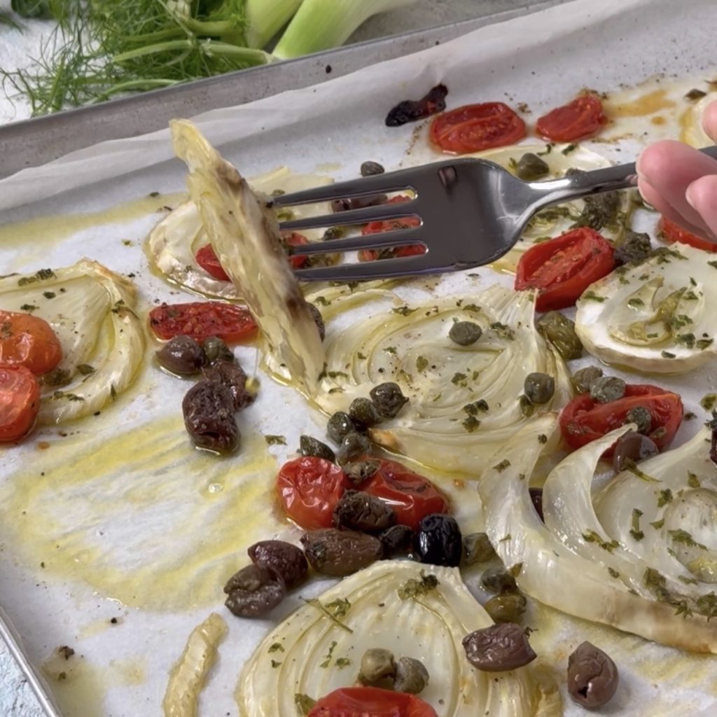 Funcho assado com tomatinhos, azeitonas e alcaparras é um acompanhamento muito fácil de fazer, saboroso e que você pode servir com qualquer prato principal de carne ou peixe. O funcho está disponível o ano todo, é bastante econômico e tem um sabor muito apreciado por muitas pessoas, por isso é uma das verduras mais consumidas na Itália. Recomendo que você confira também outras receitas com funcho. Agora vamos ver como fazer o funcho assado e, se você experimentar, me conte. Barbara