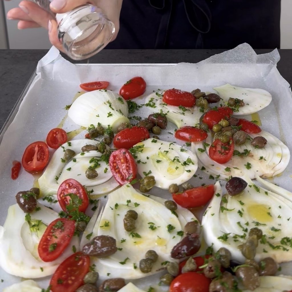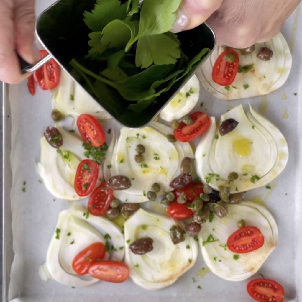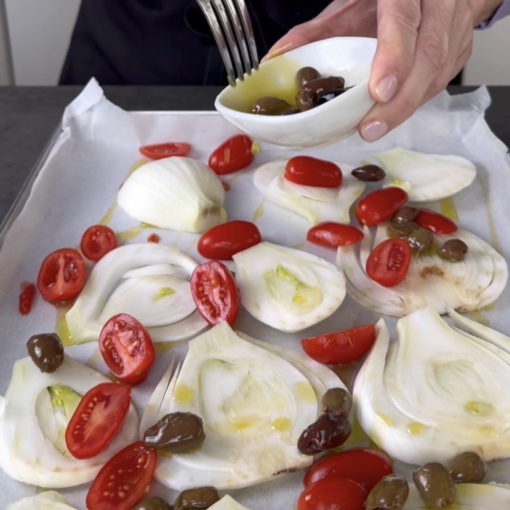 • Funcho assado com tomatinhos, azeitonas e alcaparras