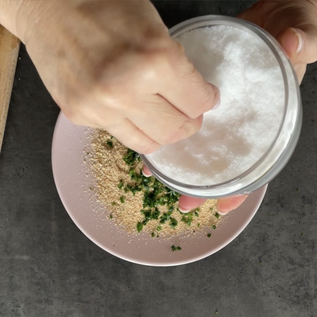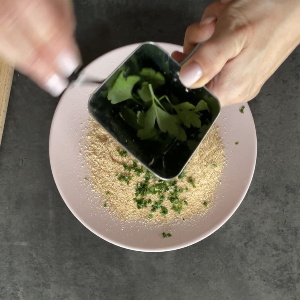Coloque os ovos em um prato e bata-os com um garfo, coloque a farinha em outro prato e o pão ralado em outro, adicione salsinha picada ao pão ralado.