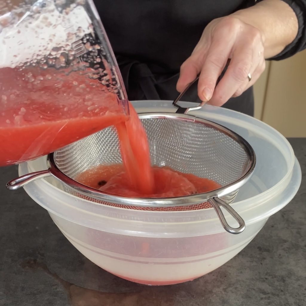 e adicione aos poucos o suco da melancia, deve obter uma mistura sem grumos.