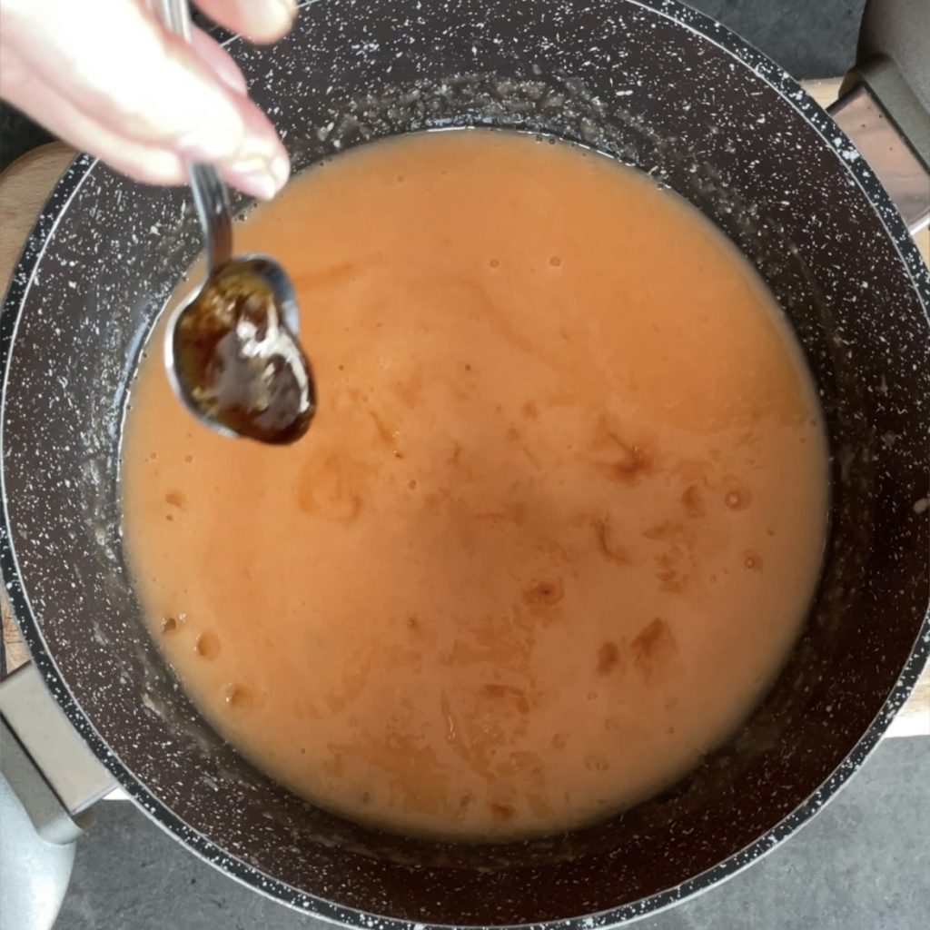 Retire a panela do fogo, adicione uma colher de chá de essência de baunilha,