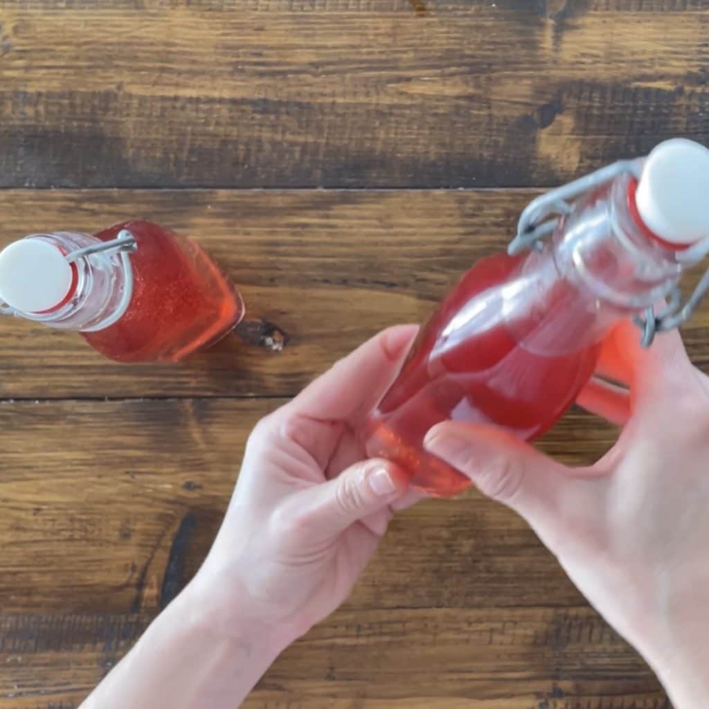 Coloque as garrafas com o Licor de morango na geladeira para descansar por alguns dias antes de consumi-lo. Como alternativa, você pode armazená-lo no congelador