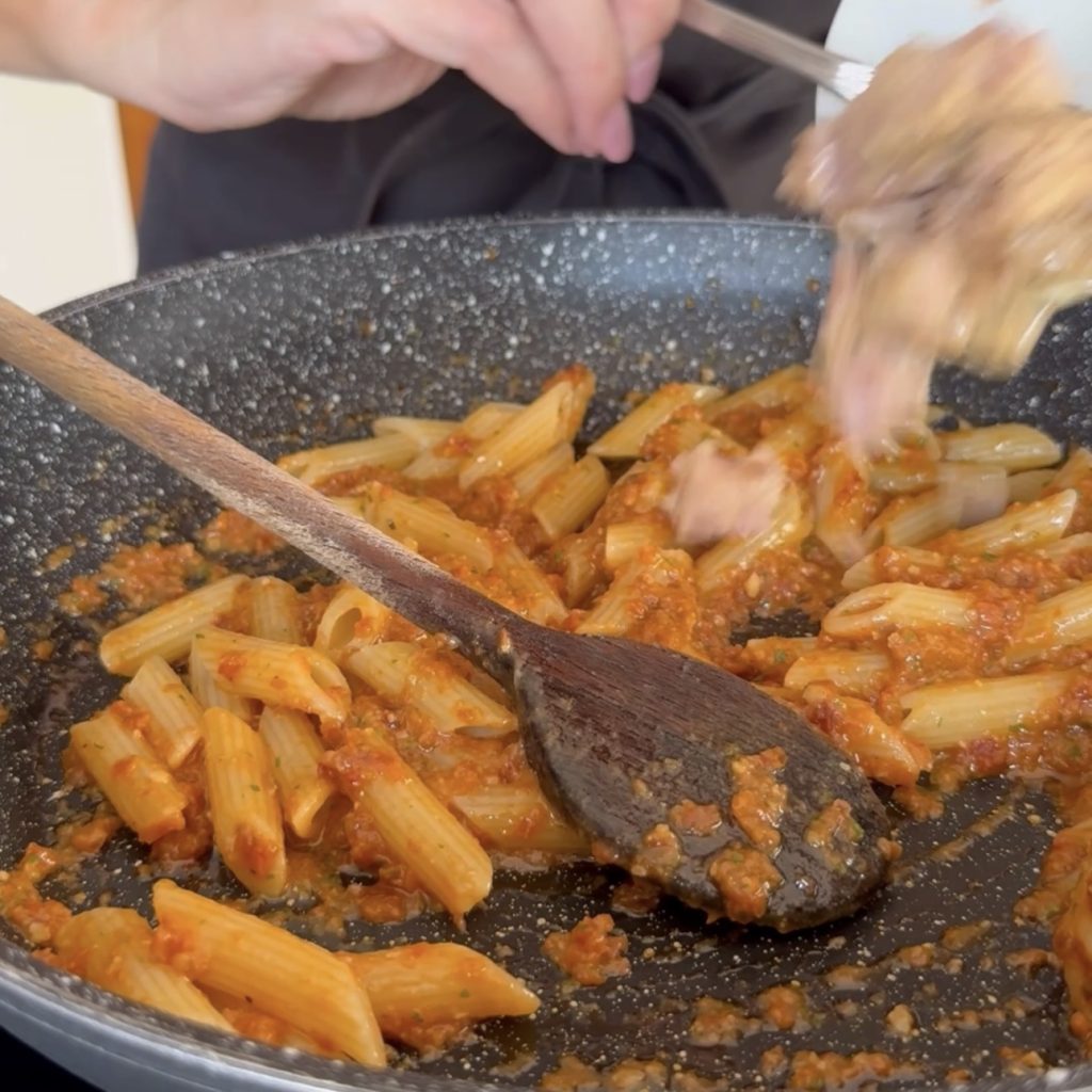 e a salsinha picada, misture bem e, se necessário, adicione a água do cozimento do macarrão aos poucos.