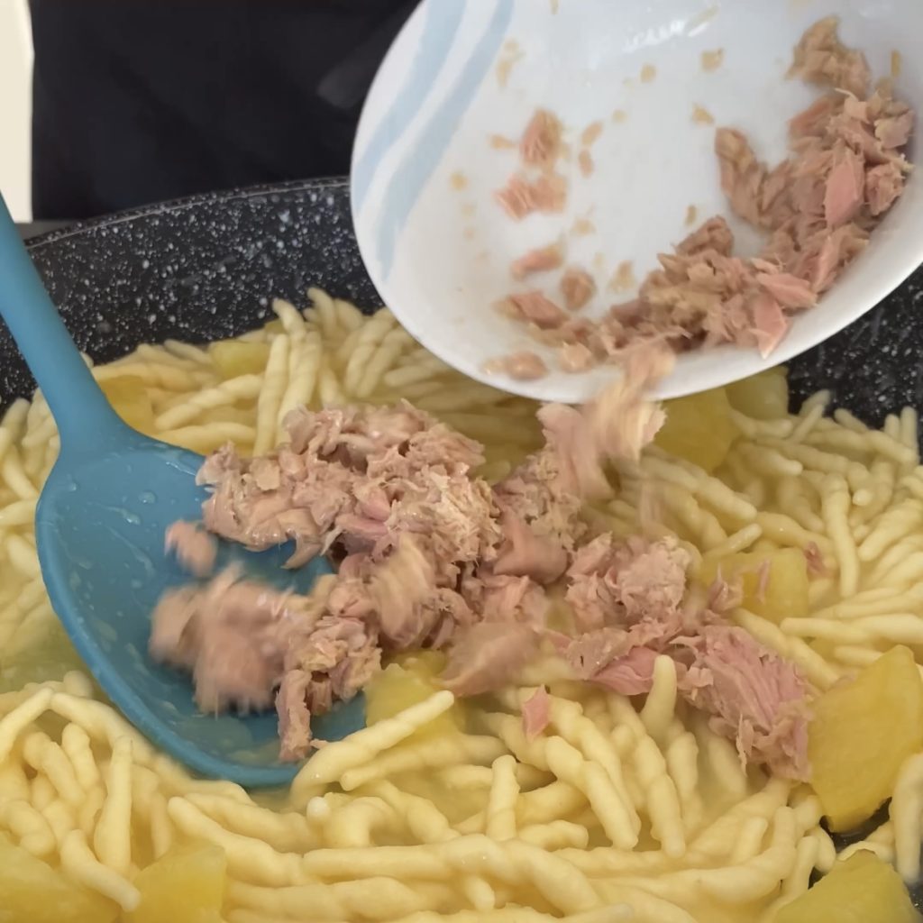 e cozinhe de acordo com o tempo indicado na embalagem. Quando o macarrão estiver pronto, escorra e coloque na frigideira com as batatas em pedaços,