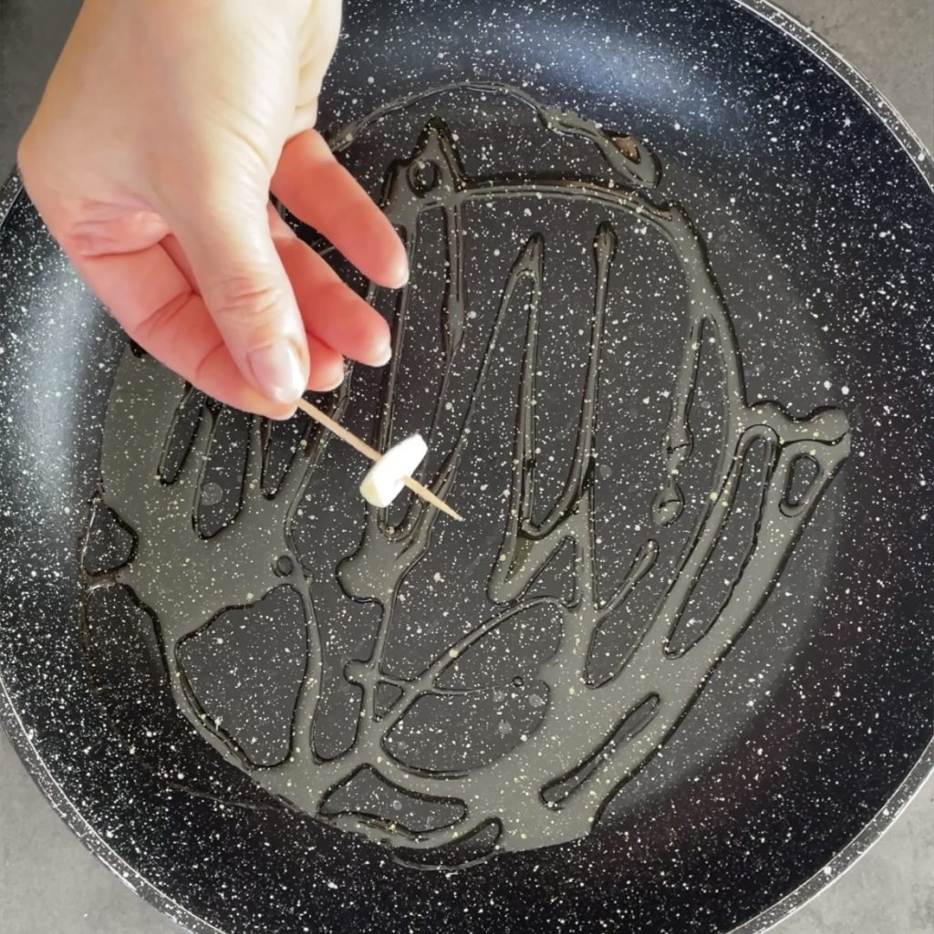 um dente de alho espetado em um palito, assim fica fácil de remover o alho quando for descartá-lo.
