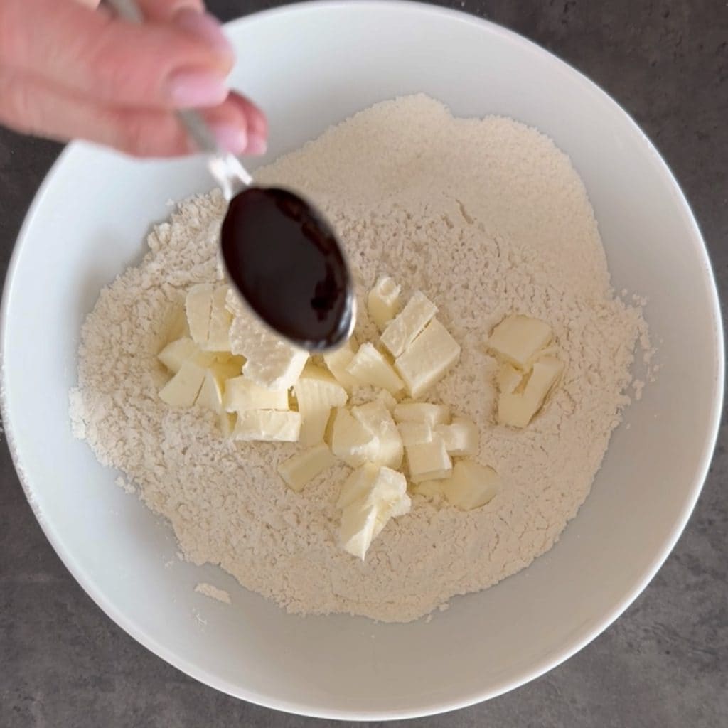 a essência de baunilha e trabalhe até obter uma mistura arenosa.