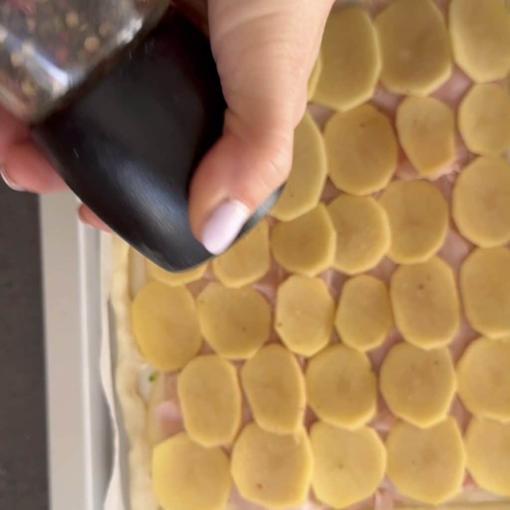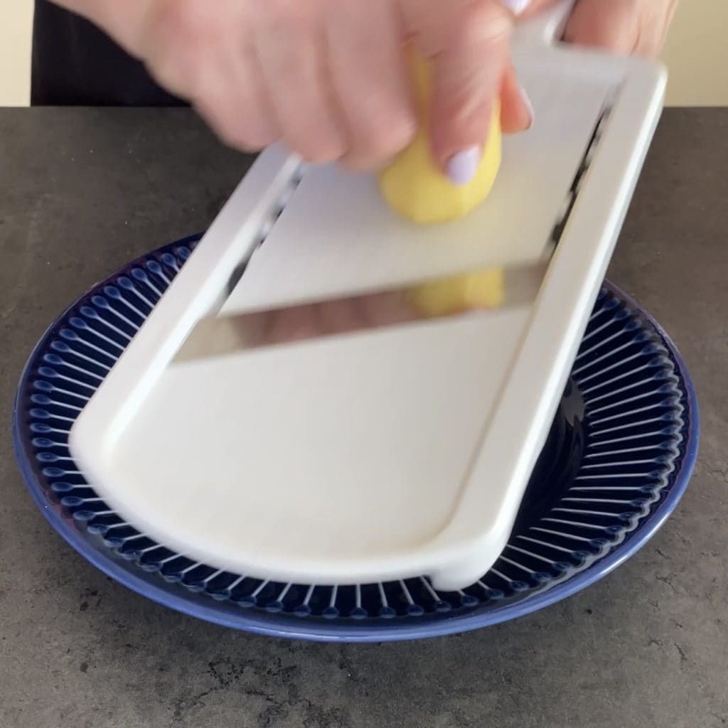 Comece a preparar a massa folhada com abobrinhas e batatas, descasque as batatas, lave-as e corte-as finamente com uma mandolina,