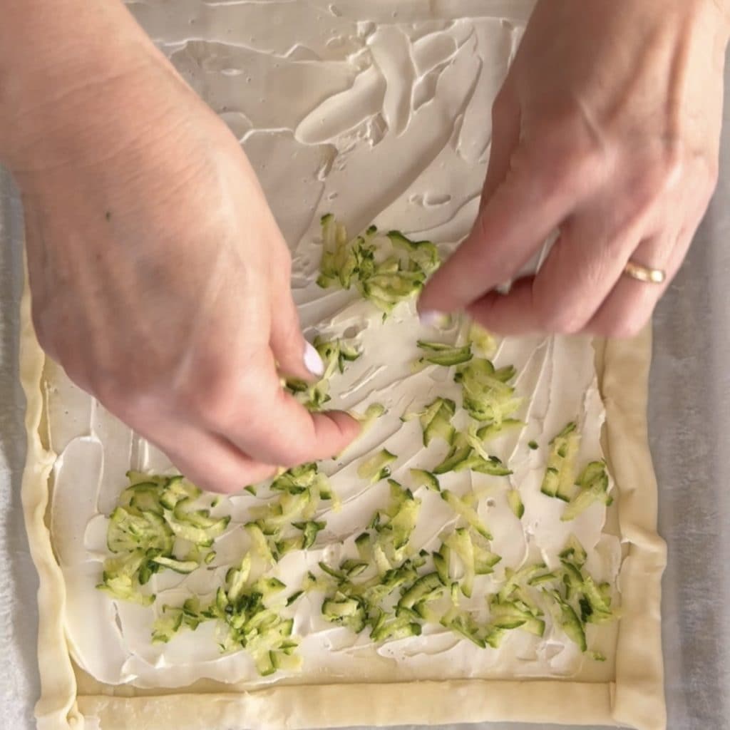 Apos assar, retire a assadeira do forno, corte a massa folhada com abobrinhas e batatas e sirva quente ou em temperatura ambiente.