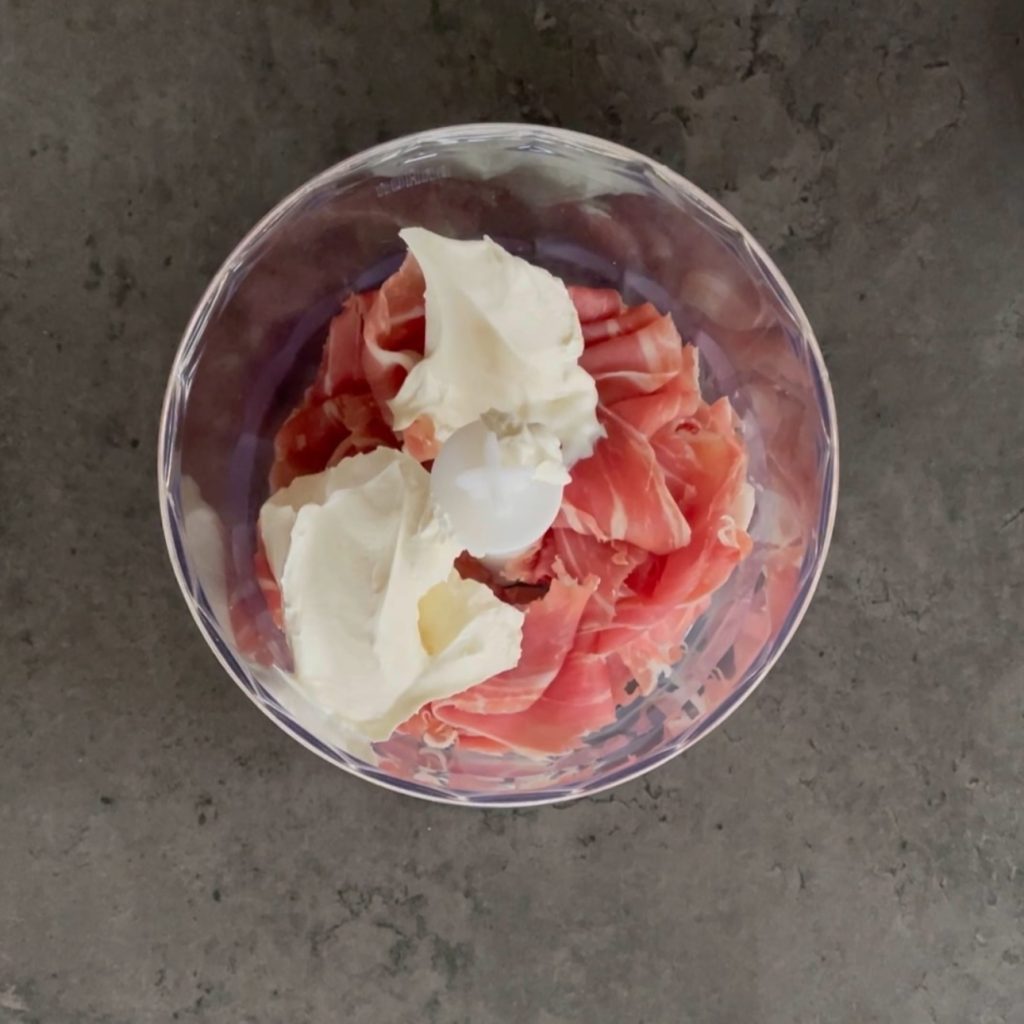 decore com um pouco de creme de presunto cru, uma fatia de presunto que você vai enrolar de modo a dar a forma de uma rosa.