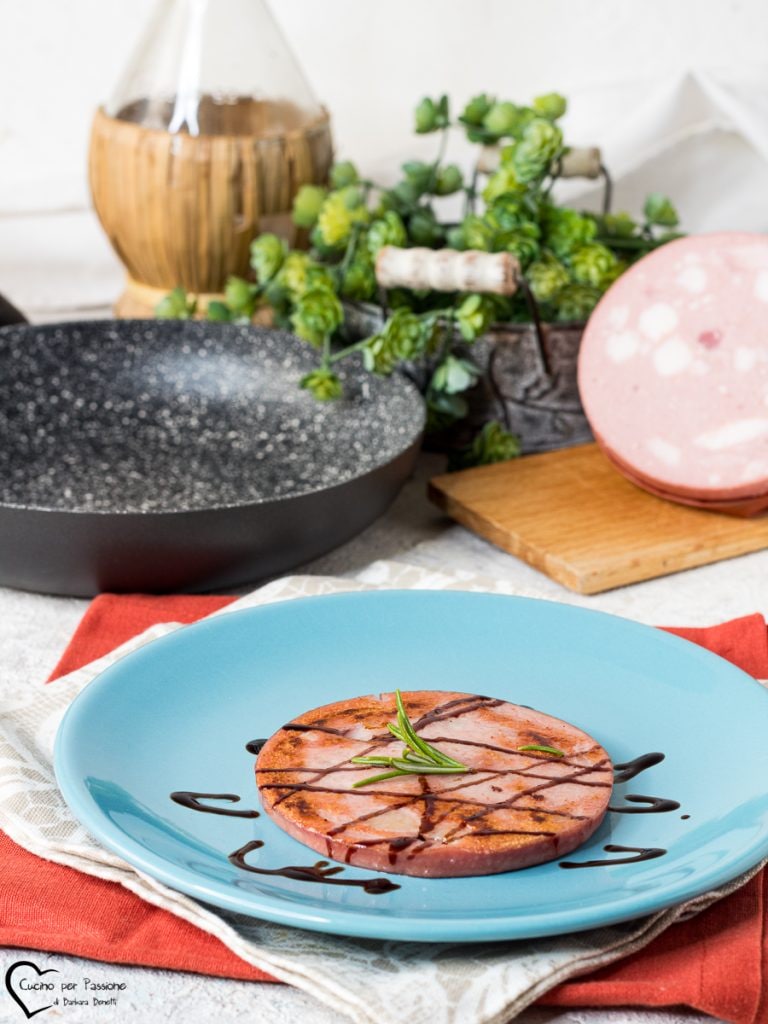 Aqueça a frigideira e quando estiver bem quente, coloque as fatias de mortadela e cozinhe por 2/3 minutos de cada lado.