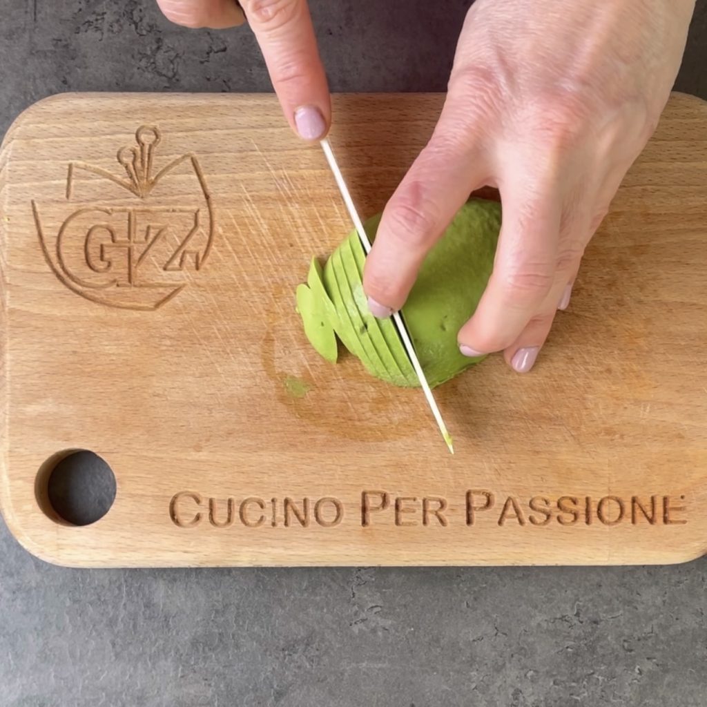 • Comece a preparar a piadina com salmão e abacate, corte ao meio o salmão, remova o caroço e a casca,