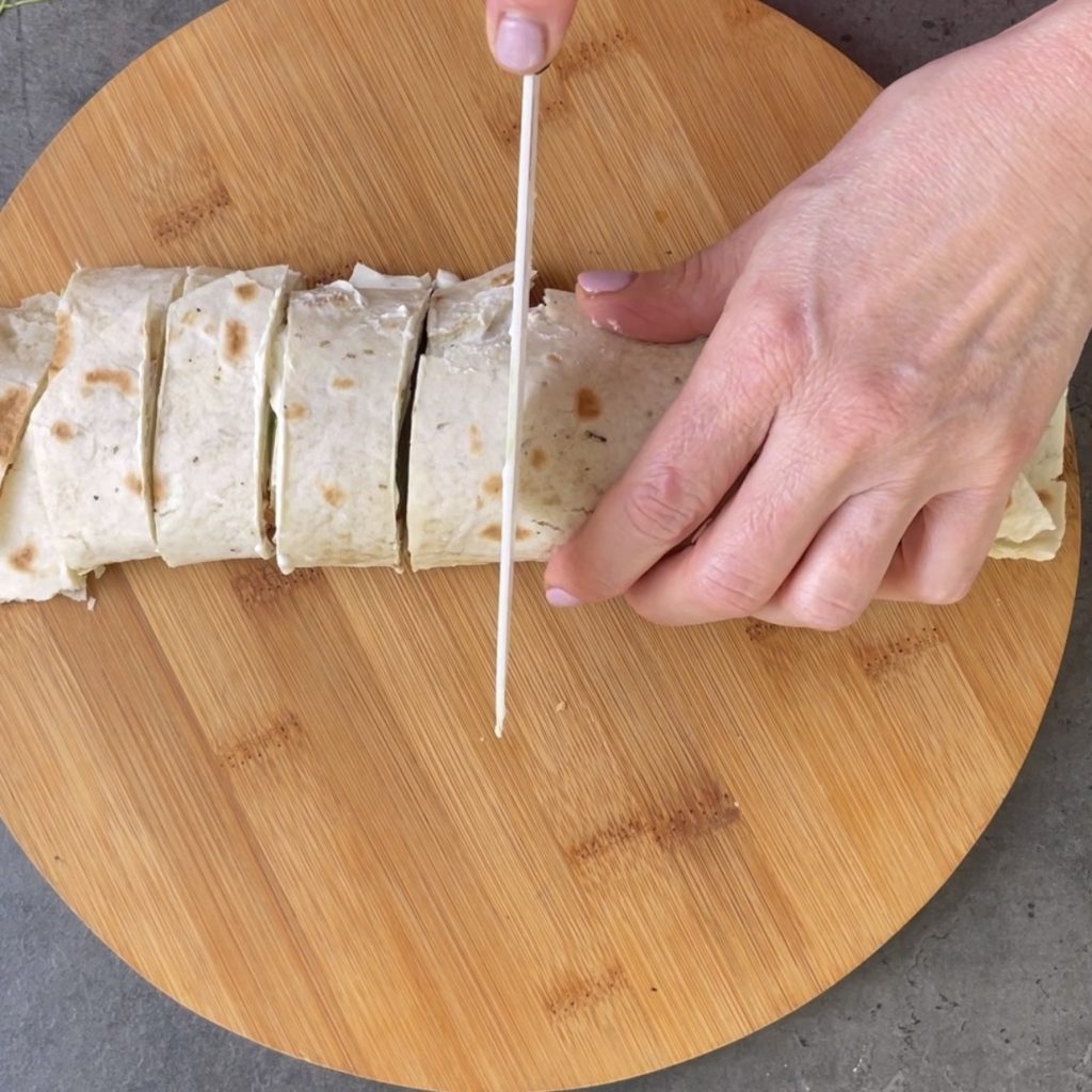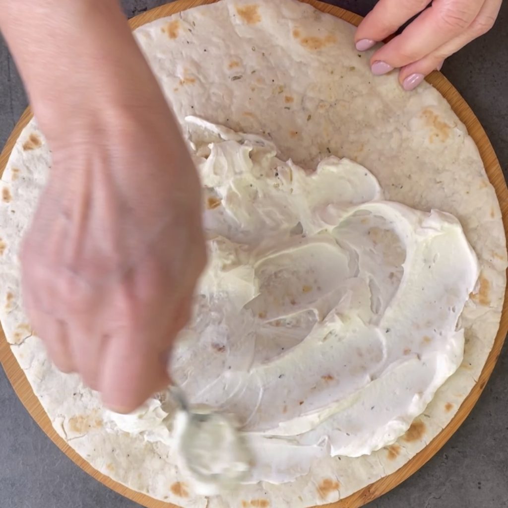 • Aqueça a piadina por alguns minutos de cada lado e espalhe o cream cheese,