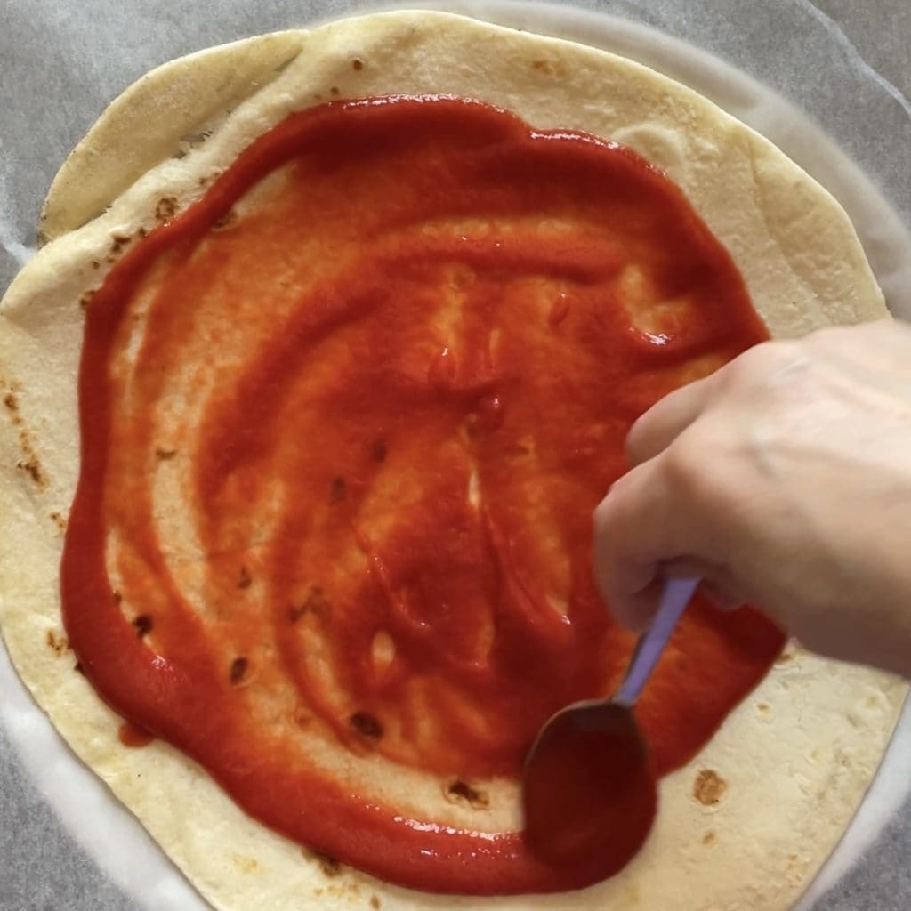 Coloque sobre a assadeira do forno uma folha de papel manteiga e organize o rap10, adicione o molho de tomate e com uma colher espalhe sobre ele, preservando as bordas.