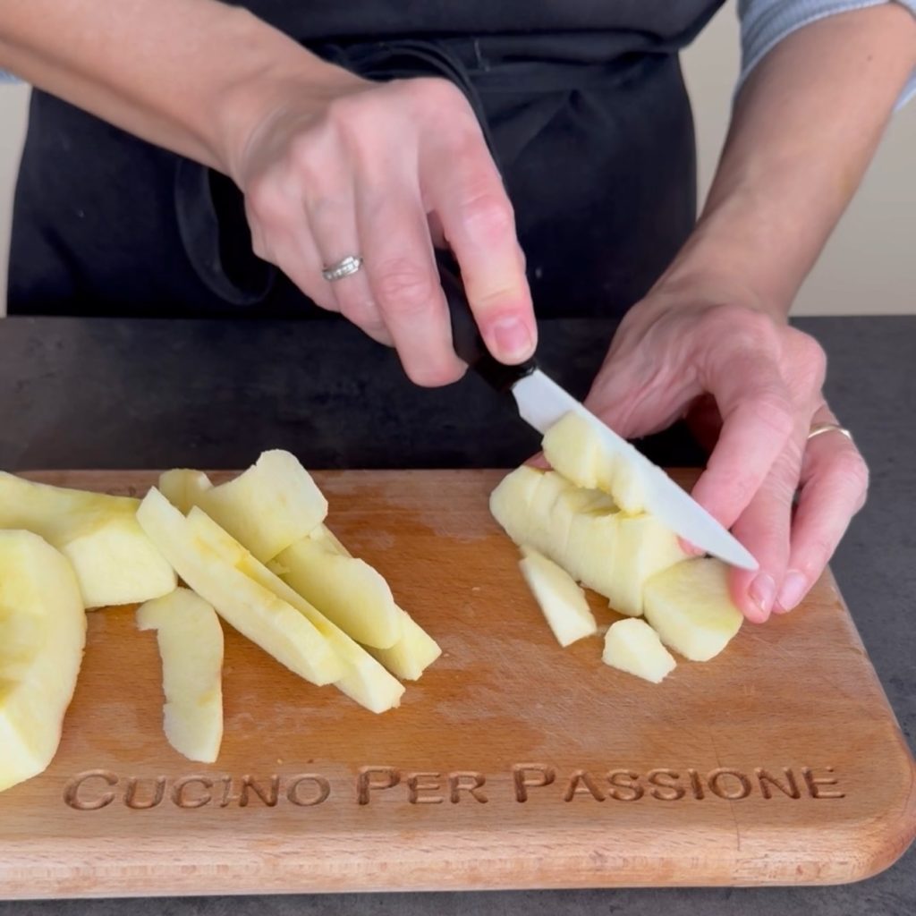 Começamos a preparar o Plumcake com maçãs, descasque a maçã, corte-a em 4 partes e remova o centro,