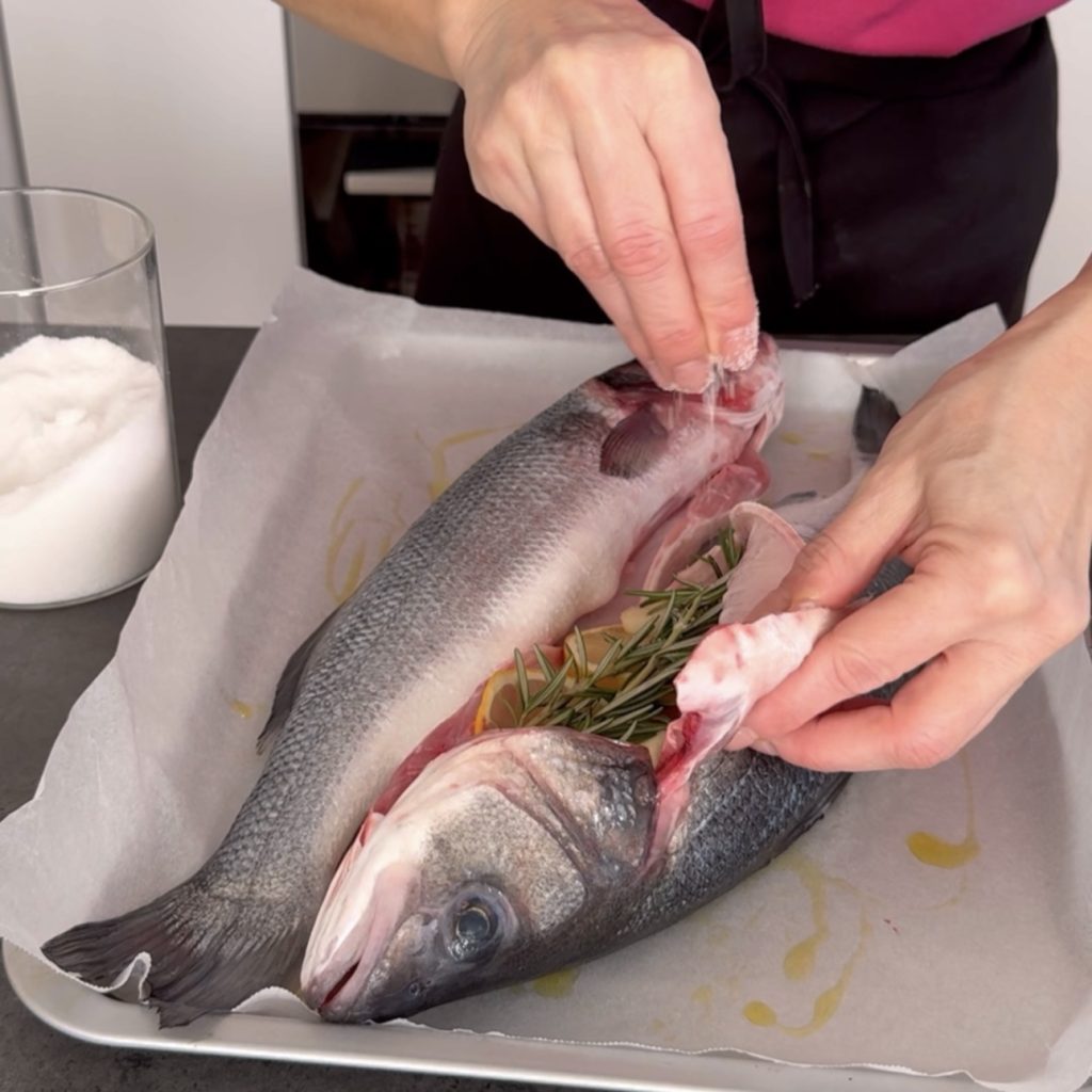 • Quando os robalos estiverem prontos, retire-os do forno, elimine as ervas internas e sirva-os em filés