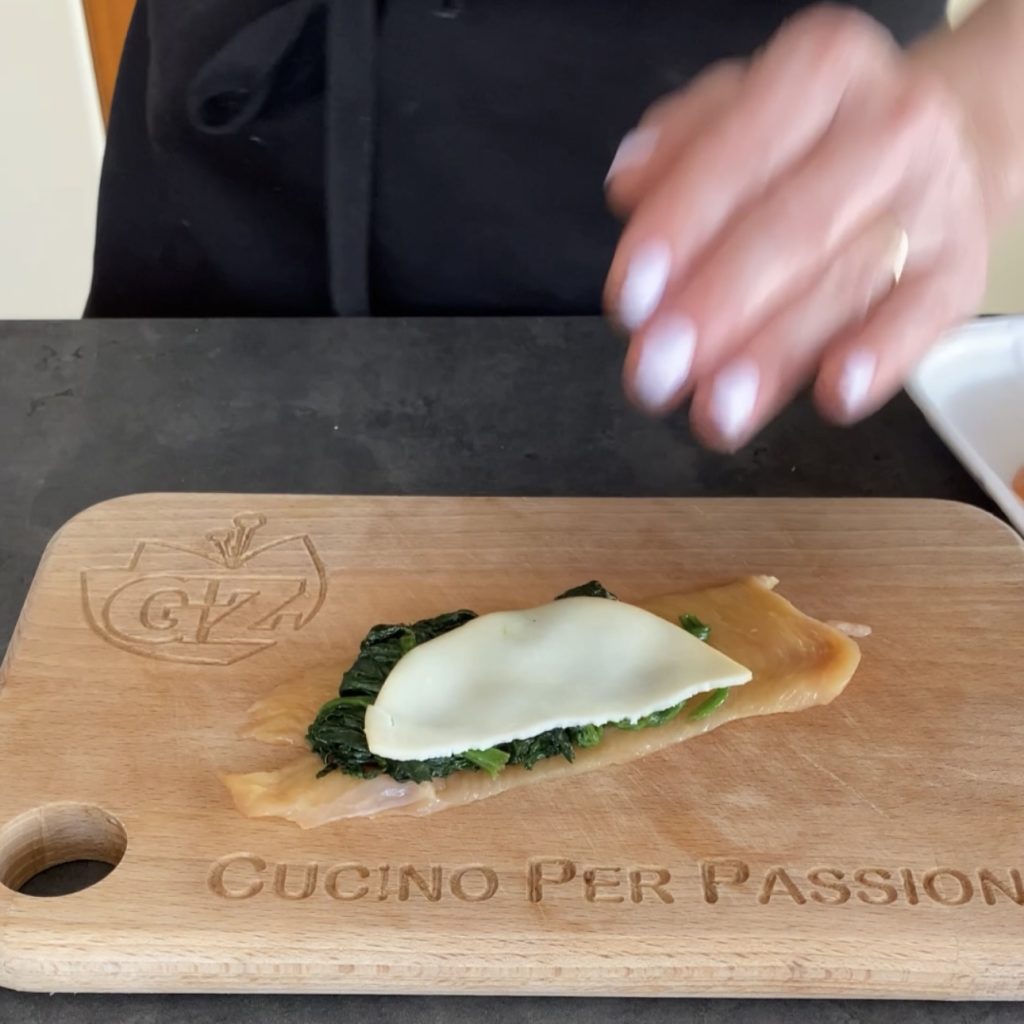 Pegue uma fatia de peito de frango e adicione os espinafres,