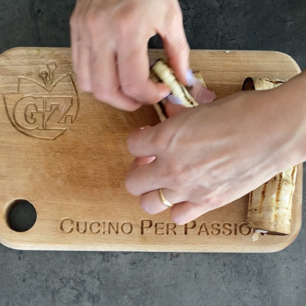 Após o cozimento, sirva os rolinhos com berinjelas grelhadas
