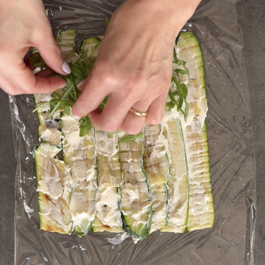 Coloque no filme plástico, organize as fatias de abobrinha grelhada de forma ordenada para formar um retângulo