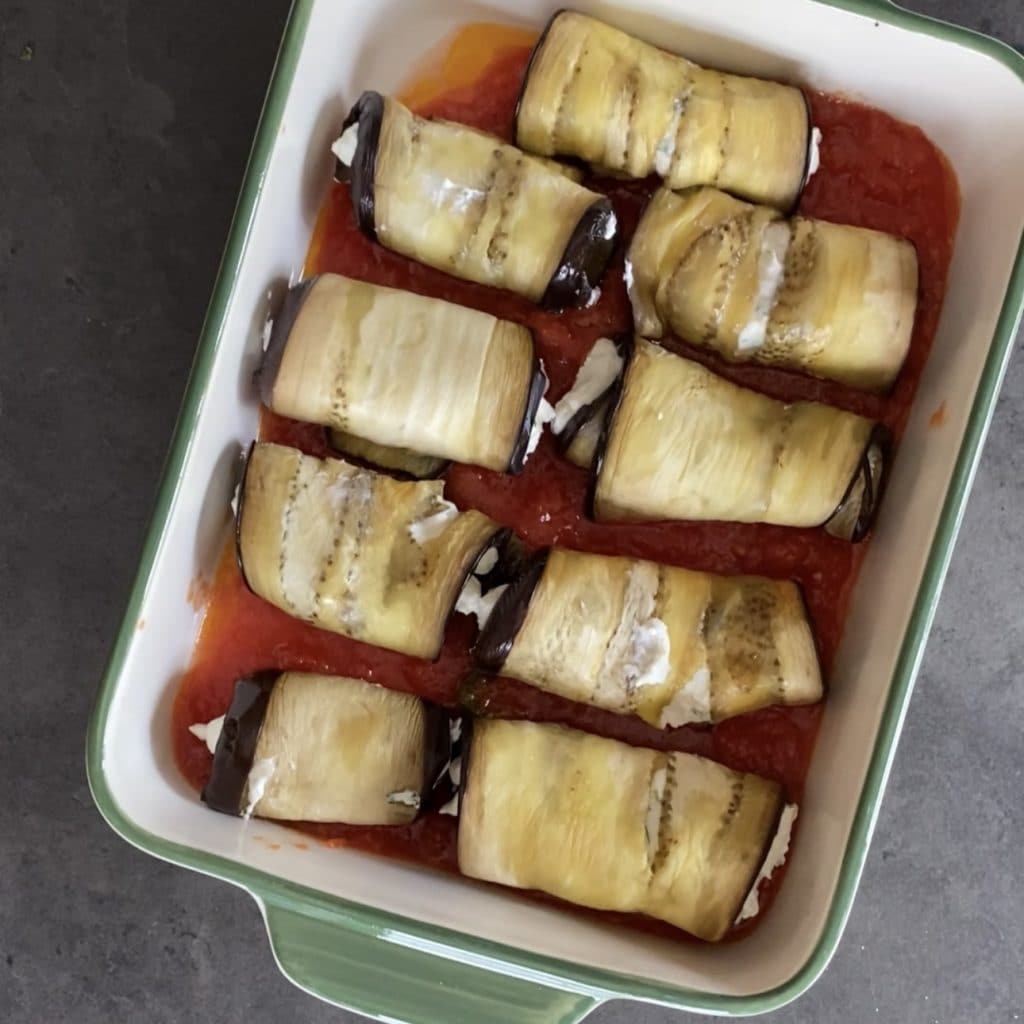 e enrole, prossiga dessa forma com todas as fatias de berinjela.