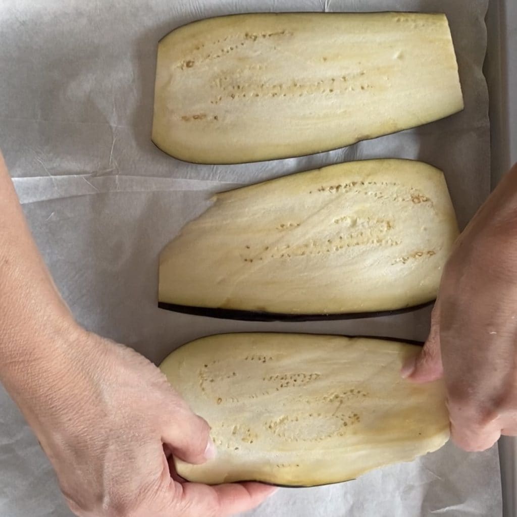 Vamos começar a preparar os Rolinho de berinjela com ricota, lave a berinjela, corte as extremidades e fatie em rodelas de cerca de 1 centímetro, não mais.