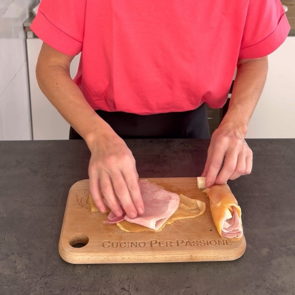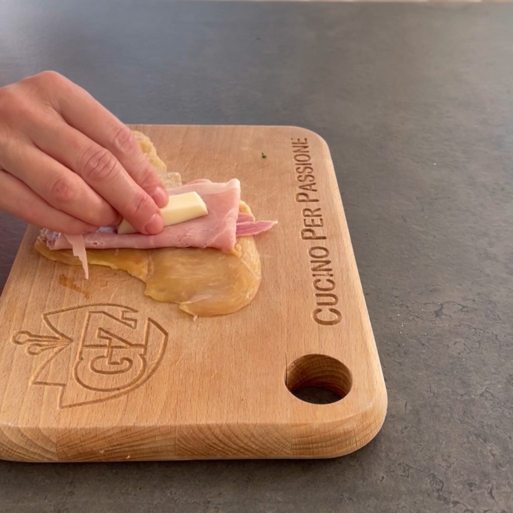 Em uma fatia de peito de frango, adicione presunto cozido,