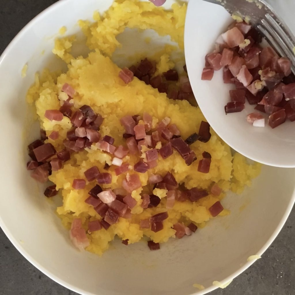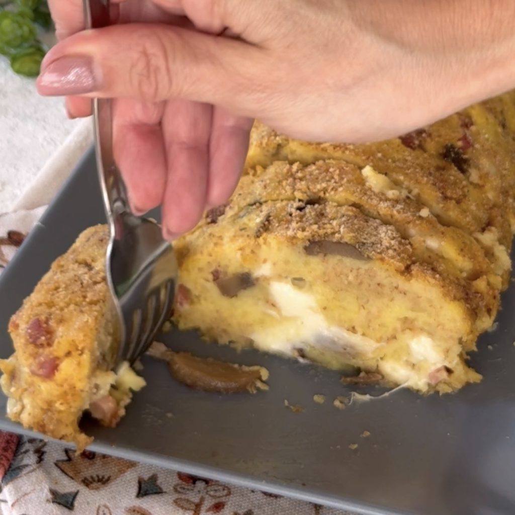 Sirva o rolo de batata com cogumelos e speck bem quente