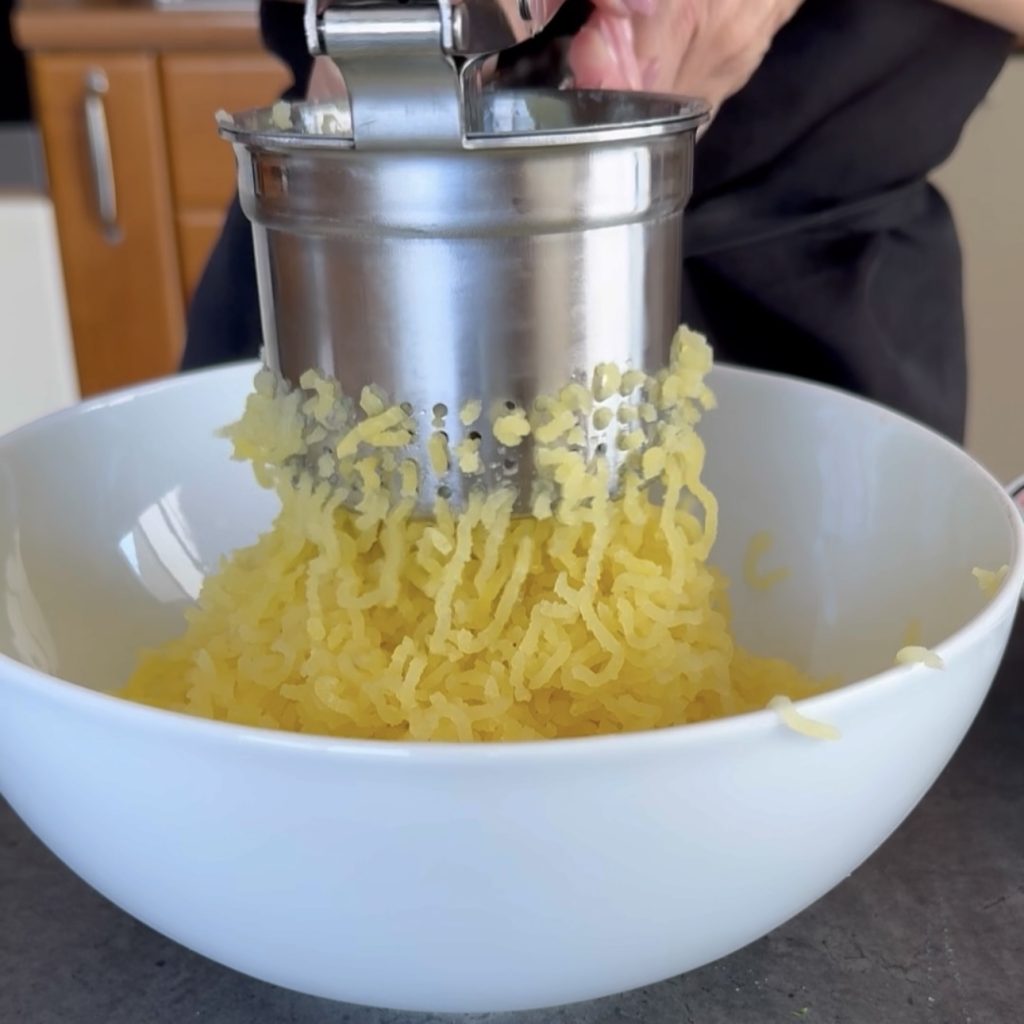 Quando as batatas ainda estiverem quentes, amasse-as com o espremedor de batatas diretamente na tigela.