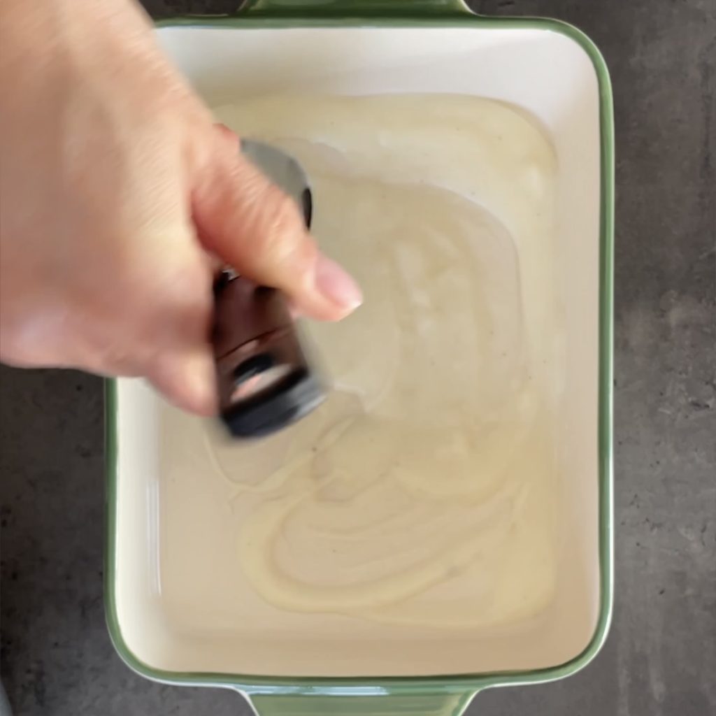 Espalhe um pouco de bechamel no fundo da assadeira.