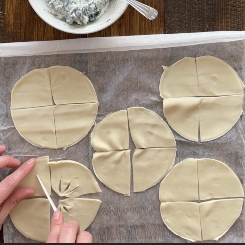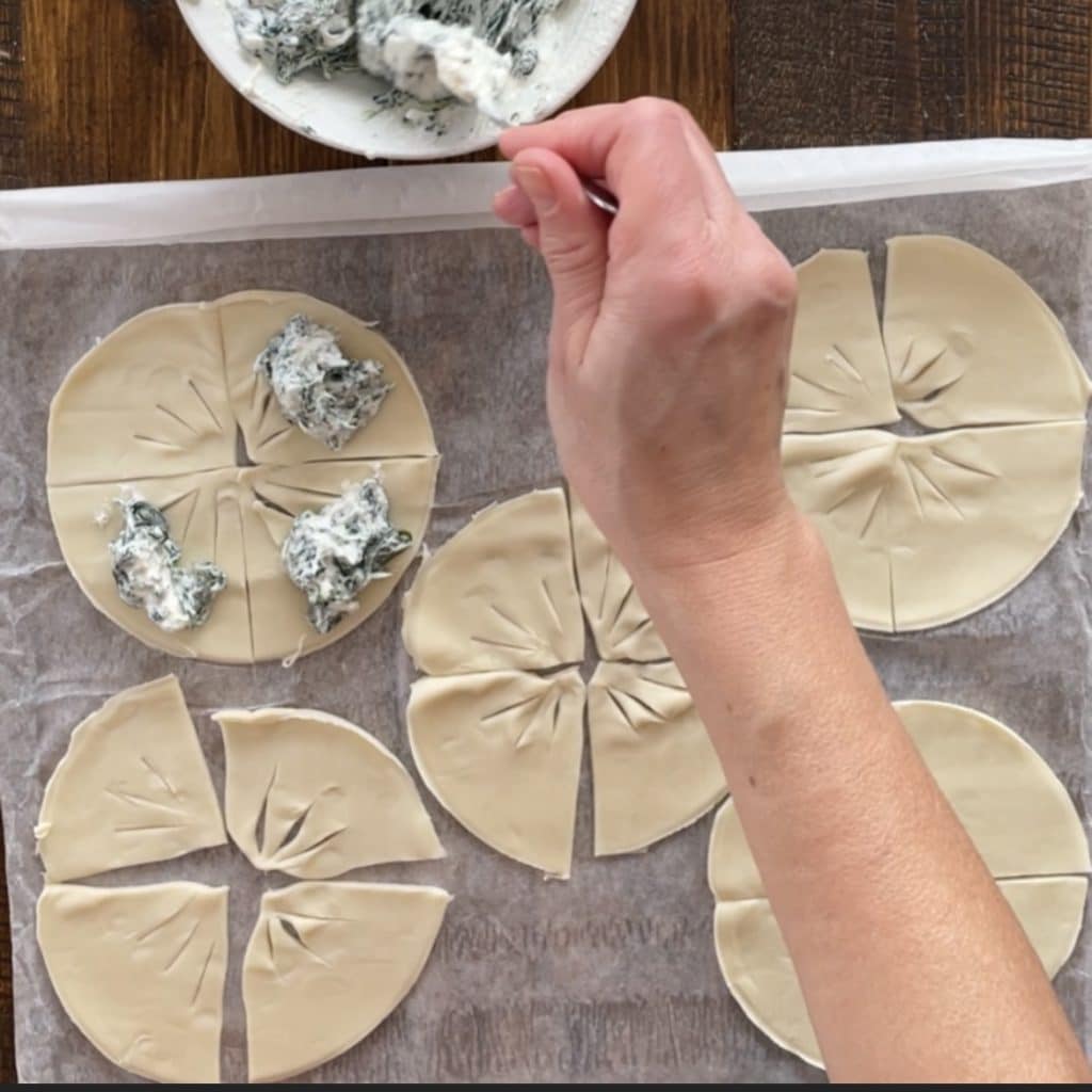 Com a ajuda de uma colher de chá, coloque o recheio na borda de cada pedaço.