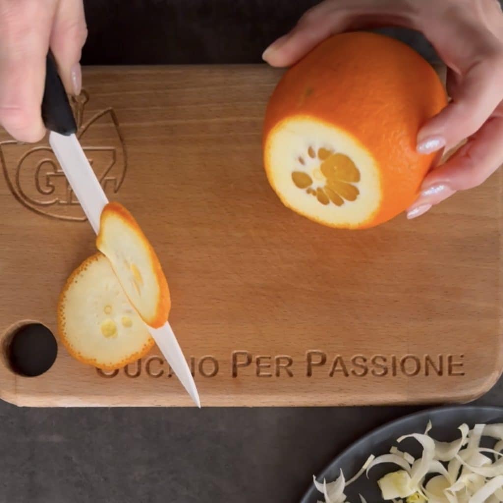 Começamos a preparar a Salada com endívia belga, lave bem a laranja, com um descascador retire parte da casca, tomando cuidado para não pegar a parte branca que é amarga,