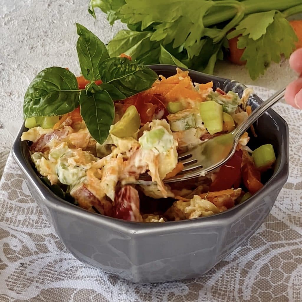 Armazene a Salada de frango com iogurte grego na geladeira por pelo menos meia hora antes de consumir.