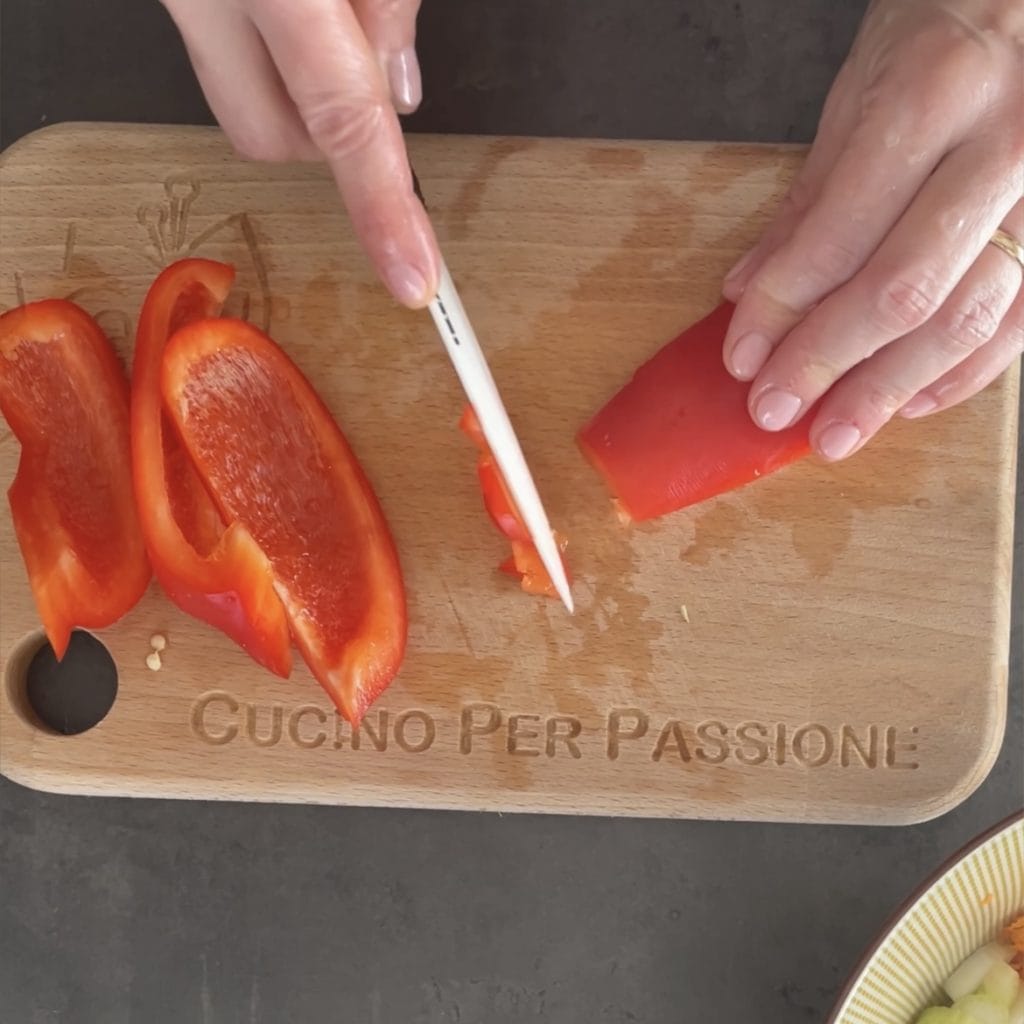 Limpe o pimentão, retire as sementes internas e corte-o em pedaços,