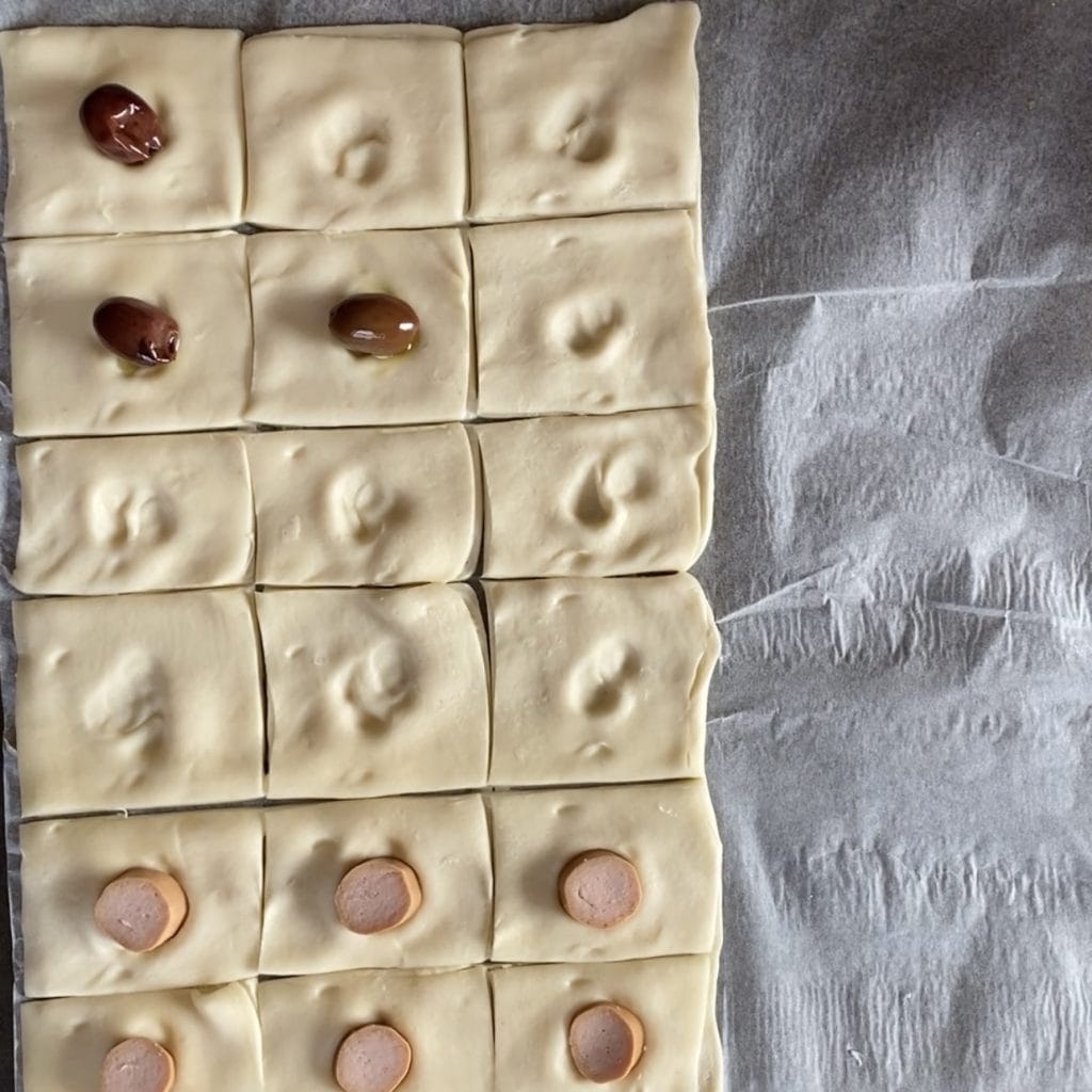 Agora coloque uma fatia de salsicha em 6 salgadinhos,