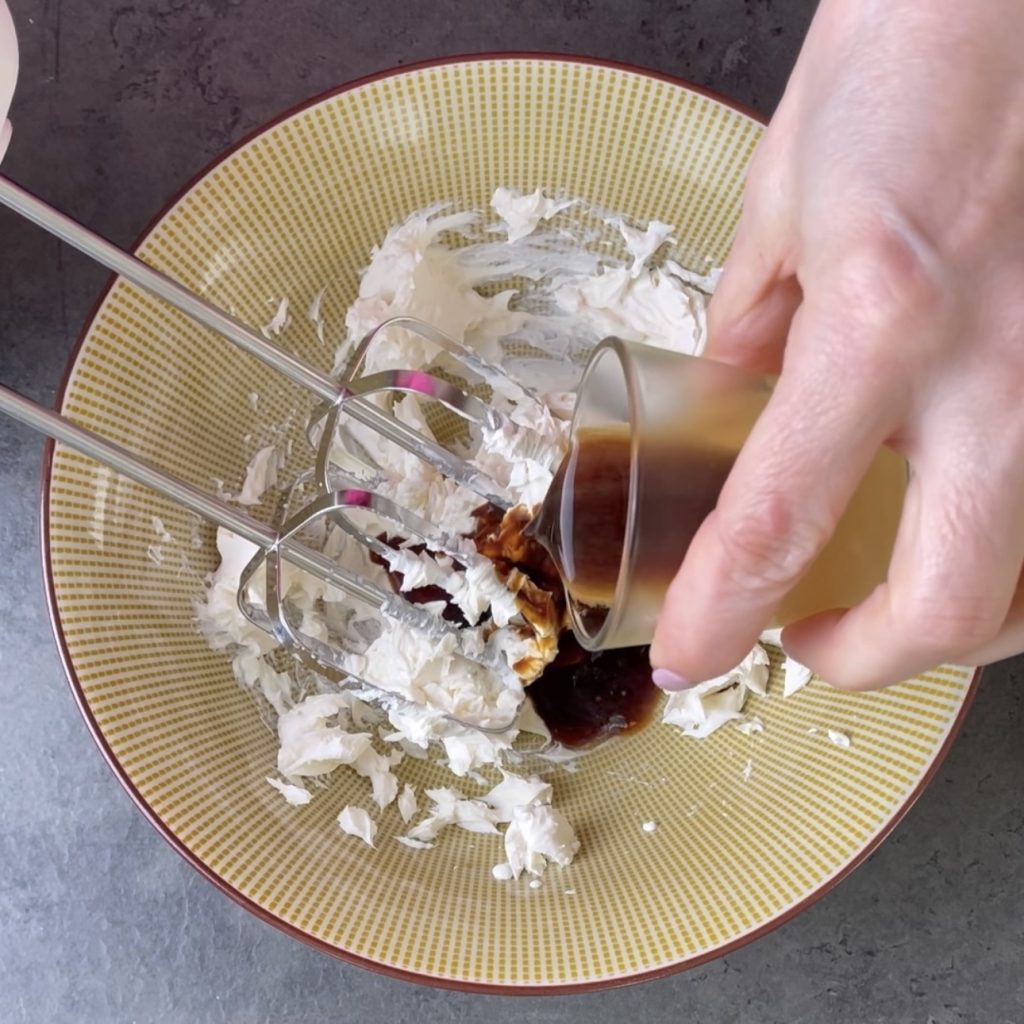 Coloque o mascarpone em uma tigela, mexa por alguns segundos e adicione uma xícara de café frio