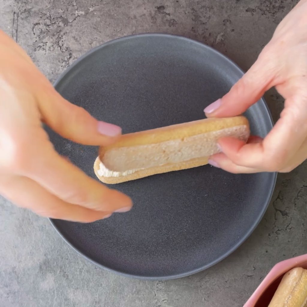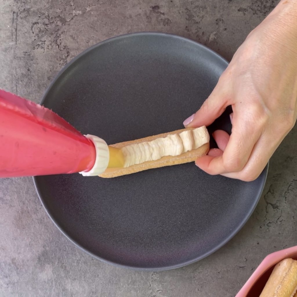 Coloque o creme em uma sac a poche, pegue um savoiardi e adicione o creme de café,