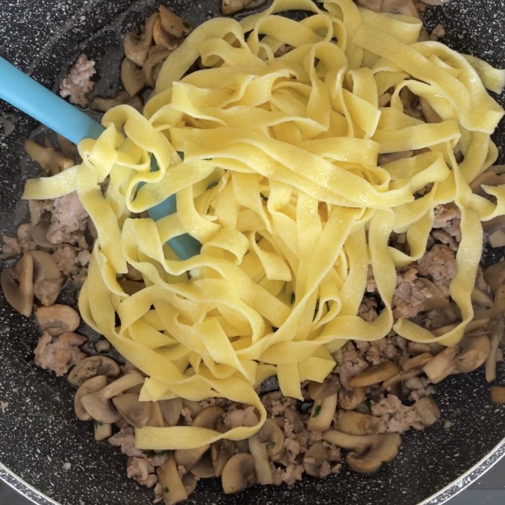 Coloque o tagliatelle na panela com os cogumelos e a linguiça,