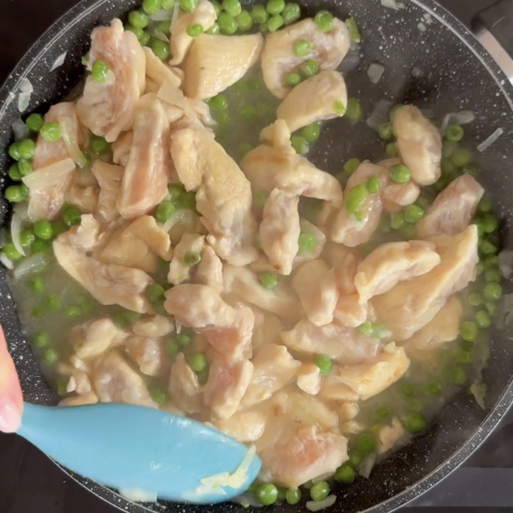 sirva as tirinhas de frango com as ervilhas bem quentes e com seu molho de cozimento. Se desejar, polvilhe com salsinha.
